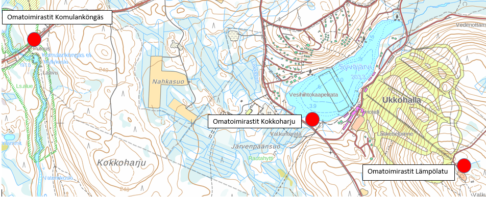Karttalinkit (eivät enää aktiivisia): Komulanköngäs, Kokkoharju, Lämpölatu, Multitörmä, Haukinotko